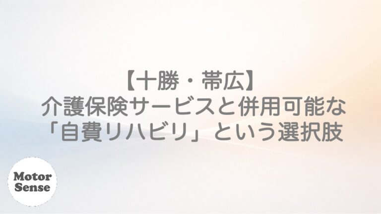 【十勝・帯広】 介護保険サービスと併用可能な「自費リハビリ」という選択肢 リハビリ病院を退院後、介護保険サービスを利用しながら生活を続ける方が多くいらっしゃいます。 【退院後のリハビリサービス】 ・訪問リハビリ ・デイケ … 続きを読む 【十勝・帯広】介護保険サービスと併用可能な「自費リハビリ」という選択肢 MotorSense 脳卒中(脳出血/脳梗塞)